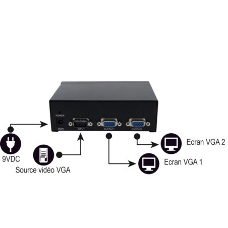 Un multiplicateur de port VGA (Splitter) permet de diffuser simultanément le signal d’une source vidéo sur plusieurs écrans VGA. Le second avantage est qu’il peut servir d’amplificateur. Vous pourrez ainsi éloigner votre écran de la source à plus de 75m.