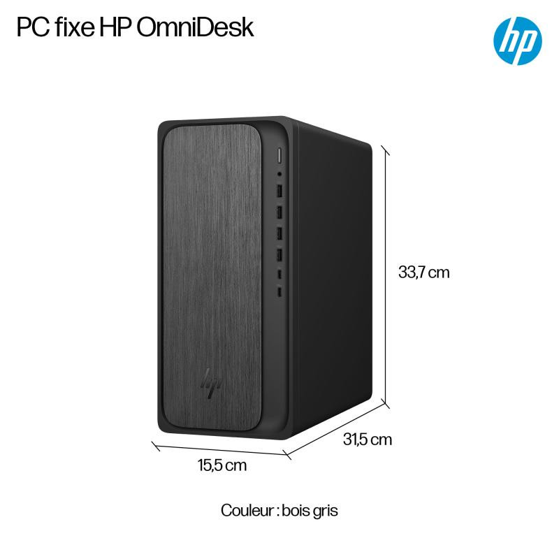 L’ordinateur HP OmniDesk est conçu avec une garniture moderne inspirée du bois gris qui se fond dans n’importe quel espace.