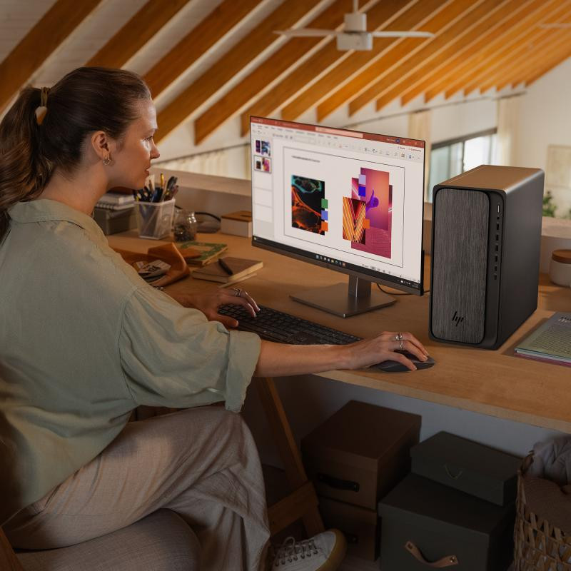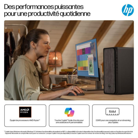 Bénéficiez de performances équilibrées et de graphiques réactifs avec le PC fixe HP OmniDesk, optimisé par les processeurs AMD Ryzen™[1]. Les capacités d’IA en option prennent en charge le multitâche fluide, tandis que la mémoire DDR5 réduit les temps de chargement. Préservez votre productivité avec les ports les plus récents, notamment le port USB-C[4] et la carte graphique en option pour des visuels immersifs.