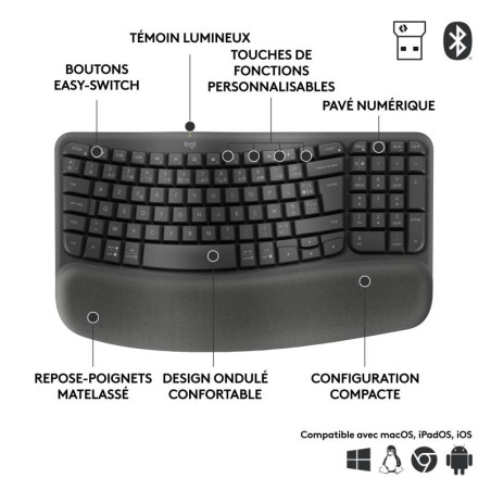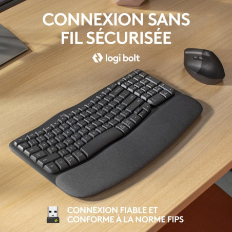 | Contenu de l'emballage | Clavier ergonomique 2pilesAAA Récepteur USB-A Logi Bolt Documentation utilisateur |