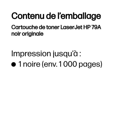 | Compatibilité | Les cartouches de toner HP 79 fonctionnent avec : HP LaserJet Pro M12, M26 |