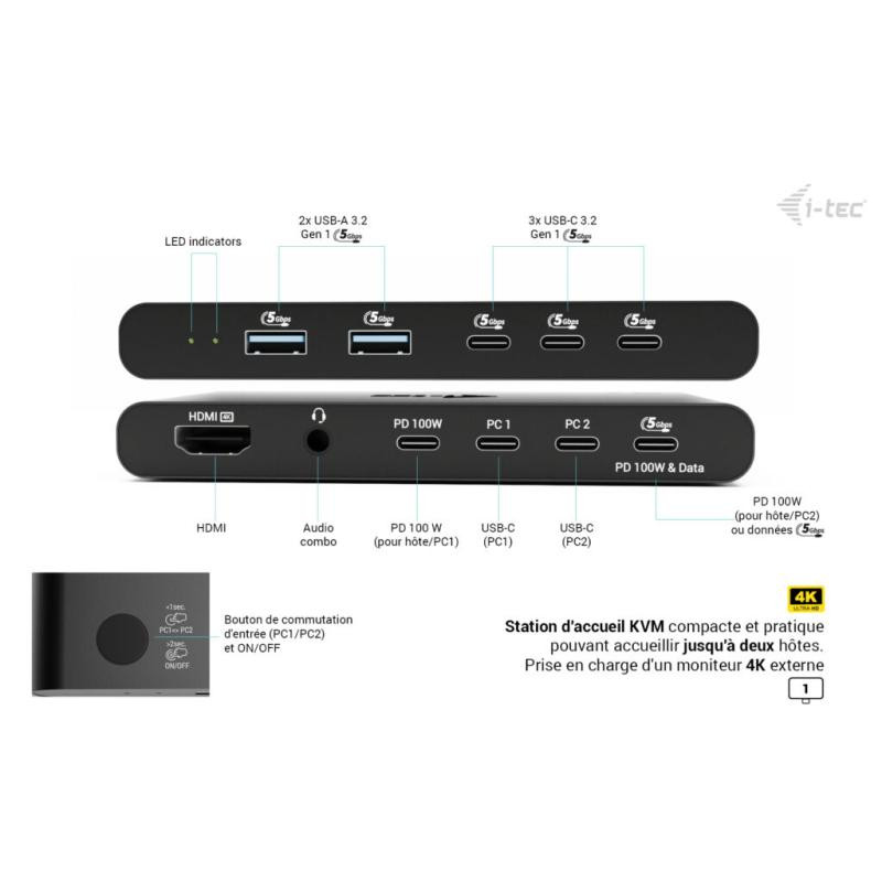 Station d’accueil compacte et polyvalente avec commutateur KVM intégré pour jusqu’à deux hôtes. Passez facilement d’un ordinateur à l’autre et partagez un seul écran, clavier, souris et accessoires. Avec la prise en charge d’un écran externe 4K/60 Hz, une double alimentation (jusqu’à 2 × 100 W*) et une large gamme de ports USB, cette station d’accueil est la solution idéale pour les professionnels à la recherche d’efficacité, de flexibilité et de gain de place.