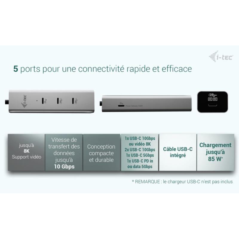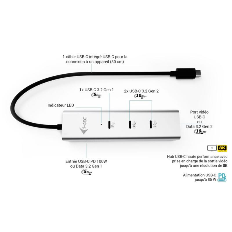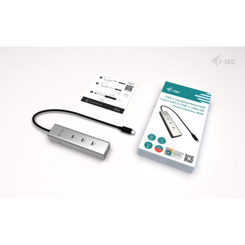 i-tec Metal USB-C Charging HUB 5port with USB-C video 8K + Power Delivery 85W. Interface de l'hôte: USB Type-C, Interfaces Hub: USB Type-C. Taux de transfert de données: 10000 Mbit/s, Taux de d'actualisation maximal: 144 Hz, Couleur du produit: Argent. Consommation électrique typique: 15 W. Prise en charge d'autres systèmes d'exploitation: Android, ChromeOS, iPadOS. Largeur: 115 mm, Profondeur: 30 mm, Hauteur: 21 mm