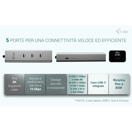 i-tec Metal USB-C Charging HUB 5port with USB-C video 8K + Power Delivery 85W