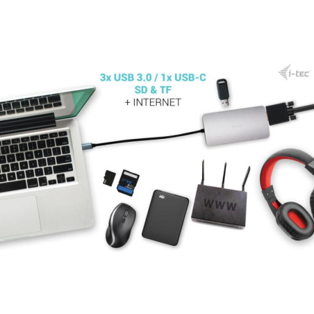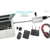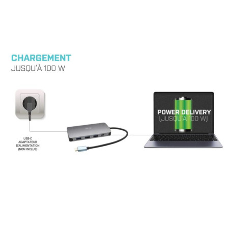 Petite station d’accueil USB-C métallique, capable de raccorder un moniteur externe/un projecteur par le biais d’un port HDMI ou VGA. Raccordez votre ordinateur portable ou tablette (aucun pilote ne doit être installé) et profitez d’un port de données USB rapide, d’une connexion Internet par le biais du port LAN et de la possibilité de raccorder un casque et un micro. Cette station pourra bien entendu aussi alimenter votre ordinateur portable et ce, jusqu’à 100 W. Cela signifie donc que vous pourrez recharger tous vos ordinateurs portables et tablettes qui sont compatibles avec une recharge par le biais de la technologie USB-C (USB-C Power Delivery).