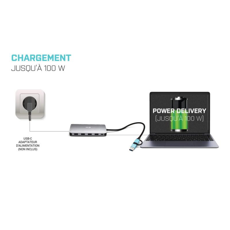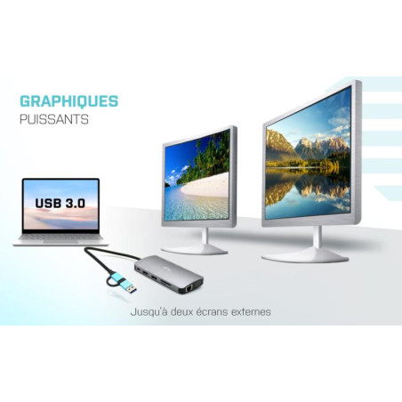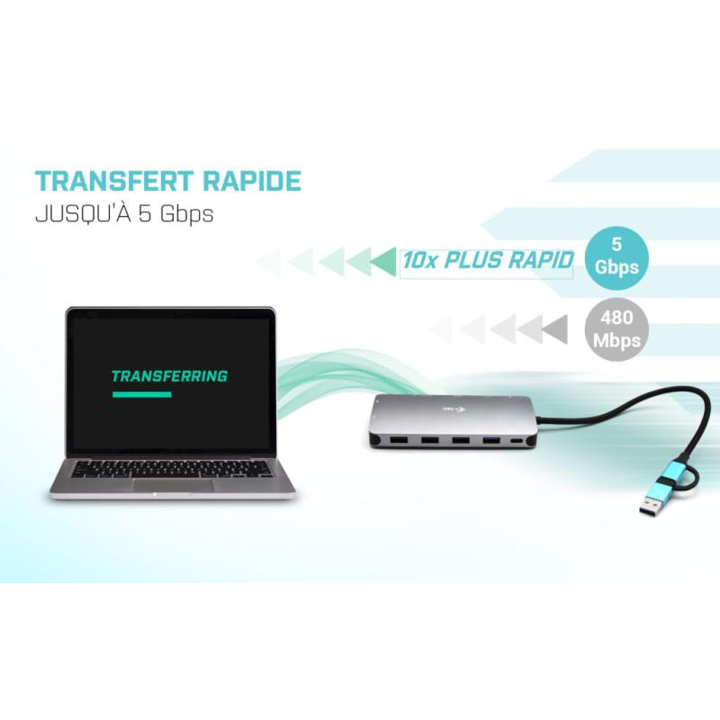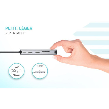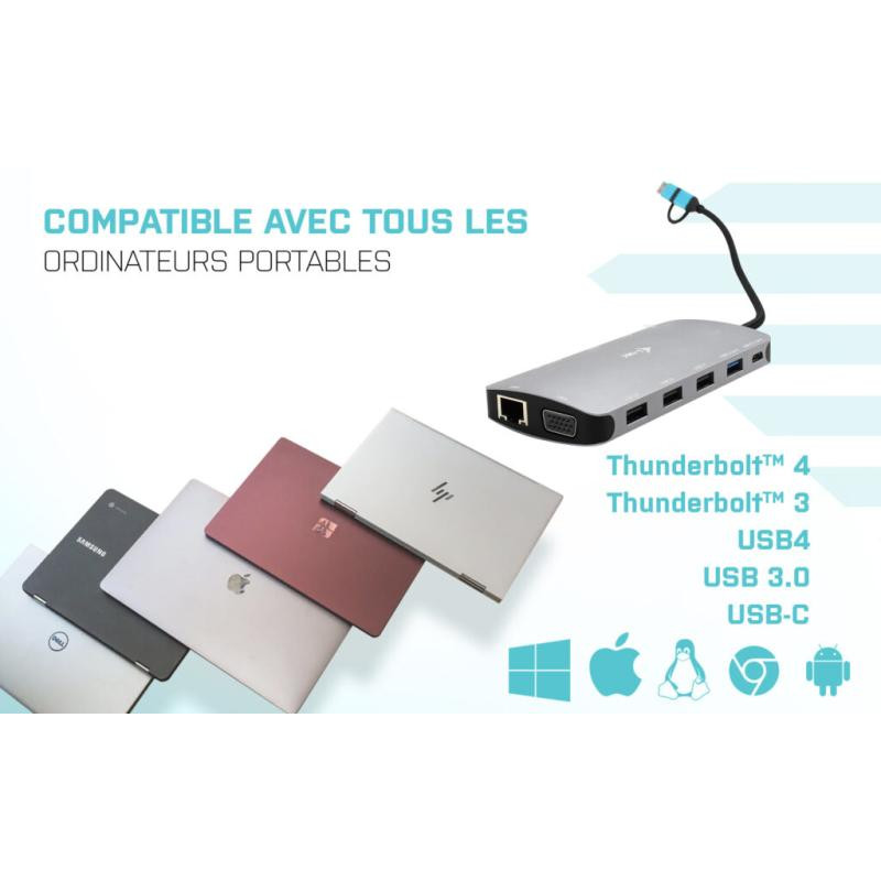 Une station d’accueil puissante, mais petite et portable, qui prend en charge jusqu’à trois moniteurs externes. La station d’accueil peut être utilisée avec pratiquement tous les ordinateurs portables, car elle prend en charge la connexion à tous les ports courants : USB 3.0, USB-C, USB4 et Thunderbolt » 3/4, tout en prenant en charge tous les systèmes d’exploitation courants. Toutefois, la connexion à trois moniteurs ne sera possible qu’avec un ordinateur portable doté d’un port Thunderbolt 3/4 ou d’un port USB-C prenant en charge le transfert vidéo (mode USB-C DP Alt).