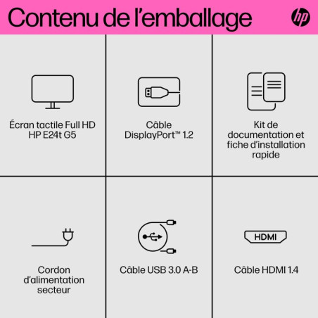 | Contenu de la boîte | Monitor; DisplayPort™ cable; HDMI cable; Warranty card; USB Type-B to A cable; Quick Setup Poster; AC power cord |