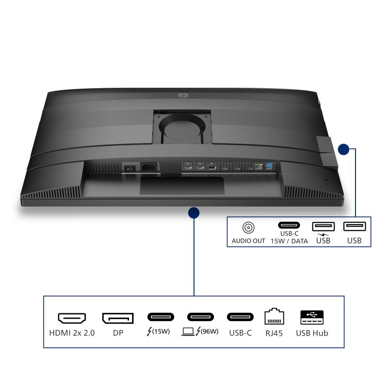 Ce moniteur avec station d'accueil Philips est équipé d'un connecteur Thunderbolt 4. Contrairement aux moniteurs USB-C conventionnels, la technologie Thunderbolt 4 permet un transfert de données ultra-rapide, prend en charge la vidéo haute résolution, offre un transport multi-flux pour une configuration en série et fournit jusqu'à 100 W d'alimentation aux périphériques externes.