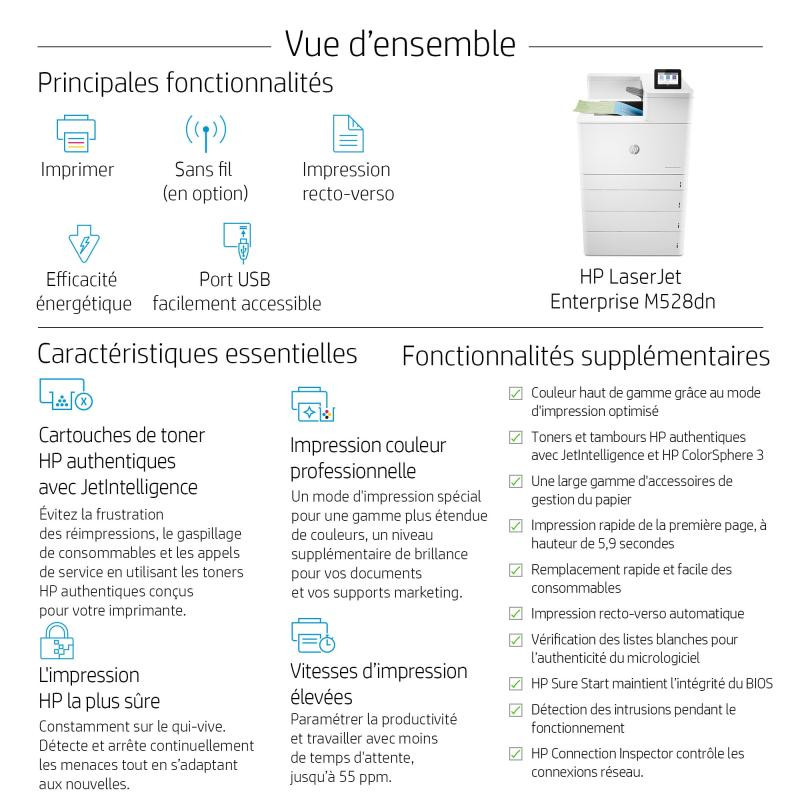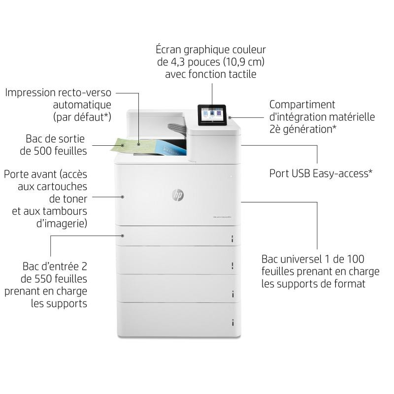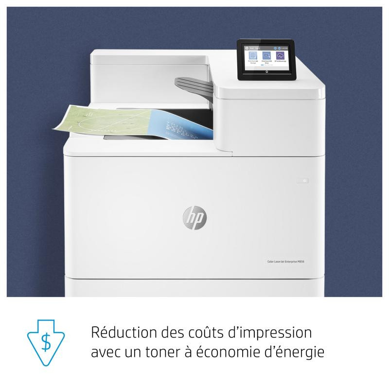 | Contenu de la boîte | HP Color LaserJet Enterprise M856dn printer; HP Black Original LaserJet Toner Cartridge (16,000 pages), HP Cyan, Magenta and Yellow Original LaserJet Toner Cartridges (13,000 pages each); 4 HP Original LaserJet Imaging Drums (65,000 pages each colour); Getting started Guide; 1 Power cord |