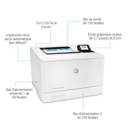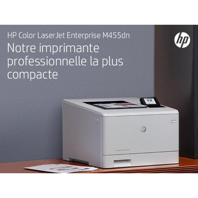 | Contenu de la boîte | HP Color LaserJet Enterprise M455dn printer; HP Black Original LaserJet Toner Cartridge (~2,400 pages); HP Cyan, Magenta, Yellow Original LaserJet Toner Cartridges (~2,100 pages each); Getting started Guide; 1 Power cord |