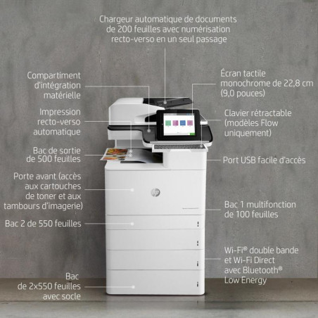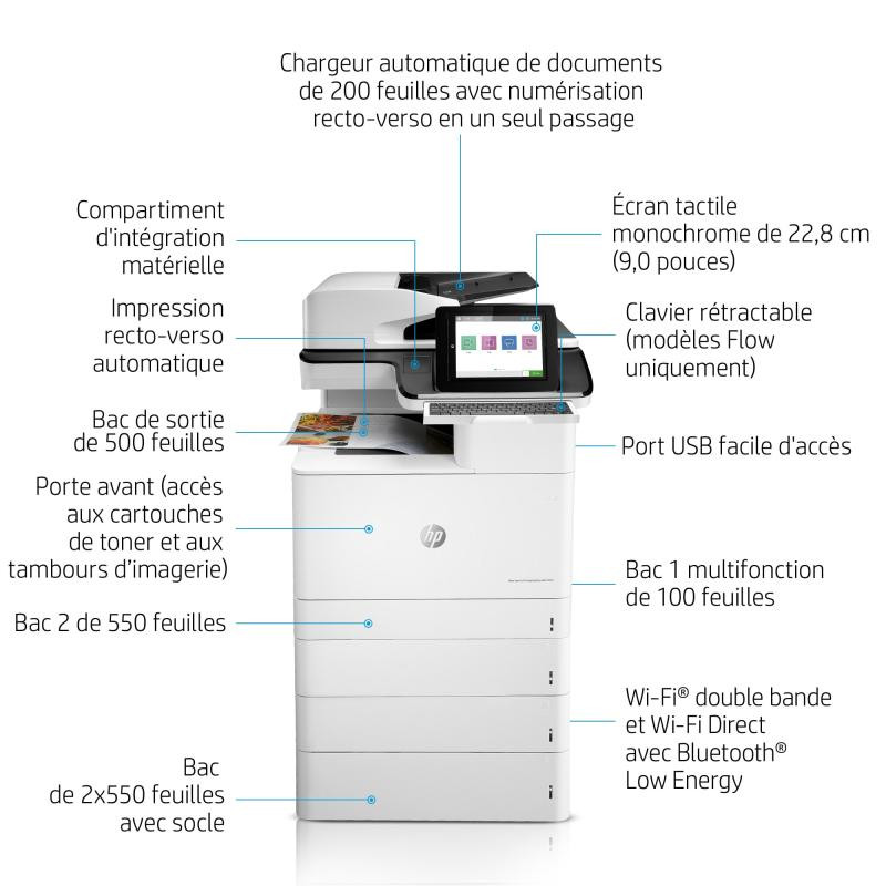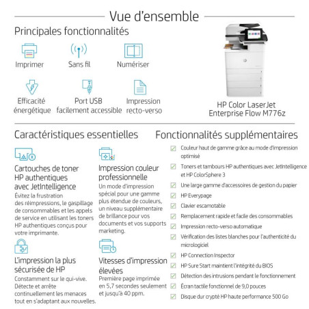 | Contenu de la boîte | HP Color LaserJet Enterprise Flow MFP M776z printer; HP Black Original LaserJet Toner Cartridge (16,000 pages), HP Cyan, Magenta and Yellow Original LaserJet Toner Cartridges (13,000 pages each); 4 HP Original LaserJet Imaging Drums (65,000 pages each colour); Getting started Guide; 1 Power cord |