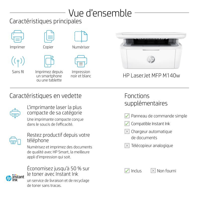 | Contenu de la boîte | HP LaserJet MFP M140w Printer; Power cord; HP Black LaserJet Toner Cartridge (yield: 300 pages); Setup Poster; Reference Guide; Warranty Guide; Flyer |