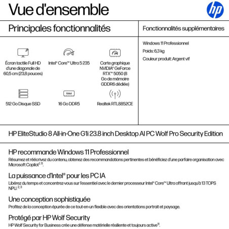 HP EliteStudio 8 G1i AI PC Wolf Pro Security Edition Intel Core Ultra 5 235 60,5 cm (23.8") 1920 x 1080 pixels Écran tactile PC