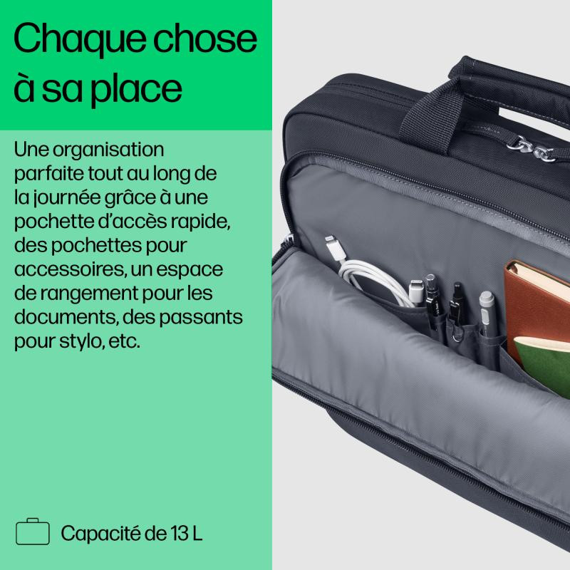 Une organisation parfaite tout au long de la journée grâce à un espace de rangement de 13 litres pour tous vos objets essentiels. Rangez tout à l’endroit prévu, grâce à une pochette à accès rapide, des poches pour accessoires, un rangement de document, des passants pour stylo, et bien plus encore.