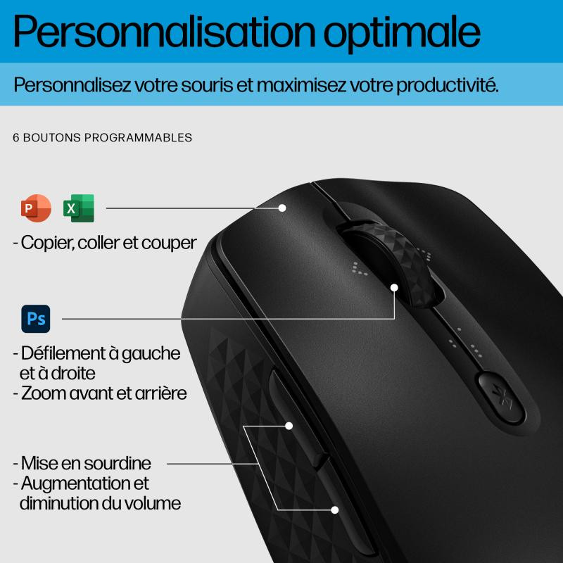 Personnalisez votre souris pour une productivité optimisée. Il vous suffit de télécharger l’application HP Accessory Center et de programmer six boutons[4] pour simplifier toutes vos tâches et vos flux de travail. Facilitez le défilement horizontal avec la molette inclinable quadridirectionnelle.