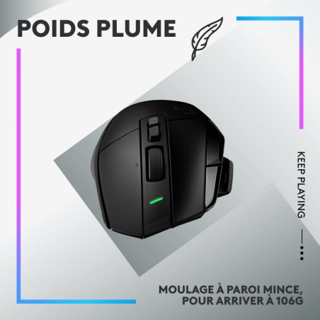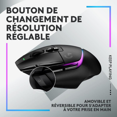 | Contenu de l'emballage | Souris gaming sans fil LIGHTSPEED G502 X PLUS Cache du bouton de changement de résolution Câble de charge USB-C Récepteur USB-A LIGHTSPEED Adaptateur de rallonge USB Documentation utilisateur |