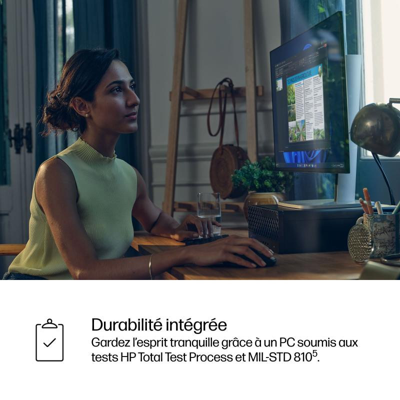 Conforme à la norme militaire américaine MIL-STD-810[7] et au test HP Total Test Process[8] pour garantir que votre PC faible encombrement respecte ou dépasse les normes HP en matière de durabilité.
